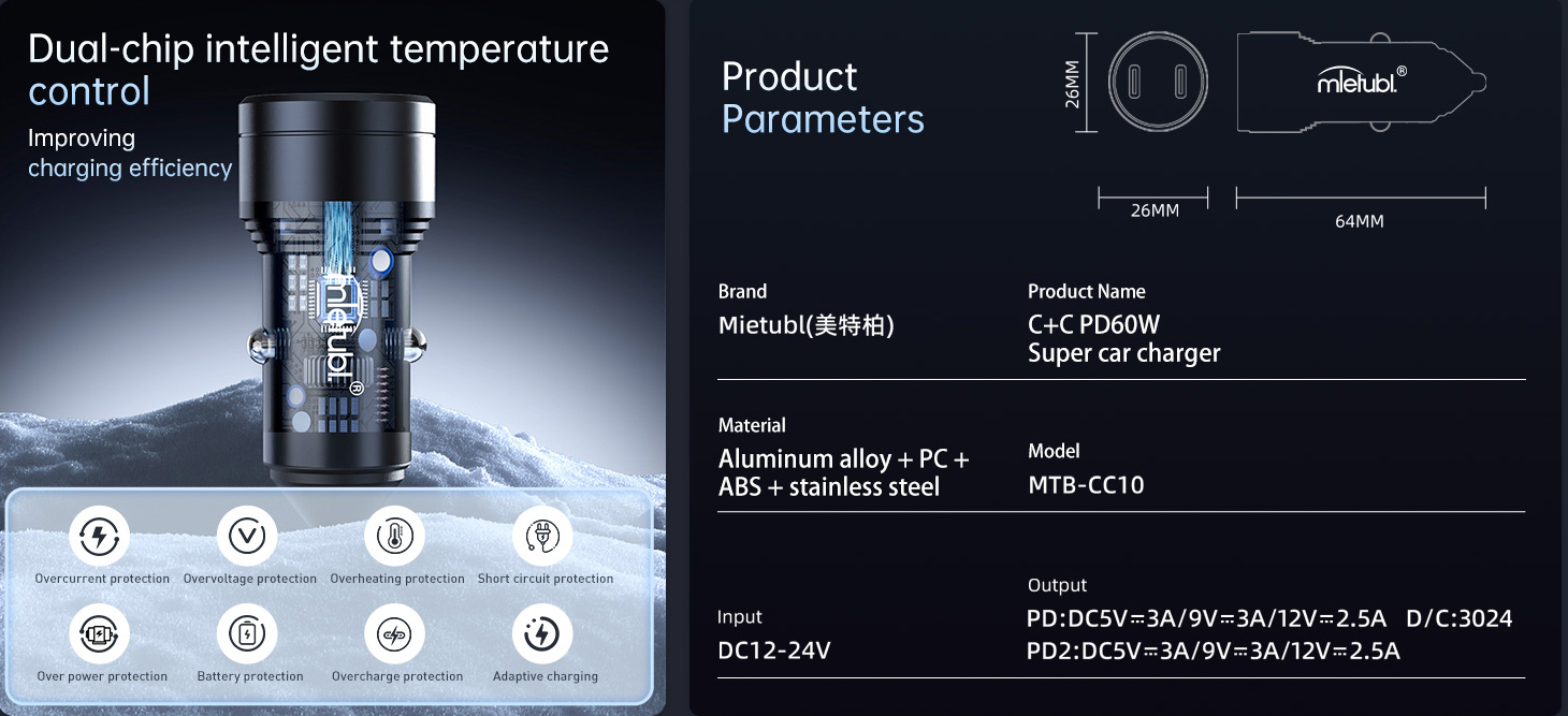 El cargador de auto MTB-CC10 es compatible con hasta PD30W de carga rápida, proporcionando un total de PD60W de potencia para la carga simultánea de múltiples dispositivos.