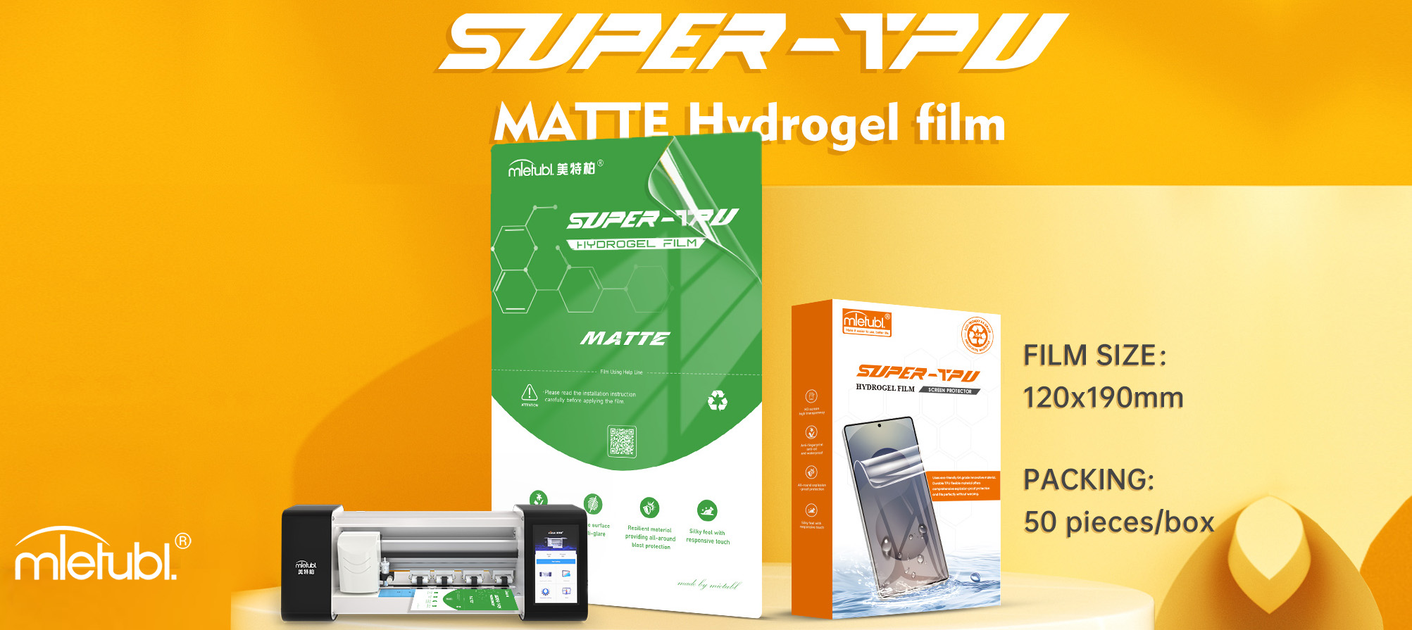 La Caja de 50 Láminas Hidrogel Super TPU de Mietubl es una solución confiable para quienes ofrecen servicios de protección de pantallas a dispositivos electrónicos.